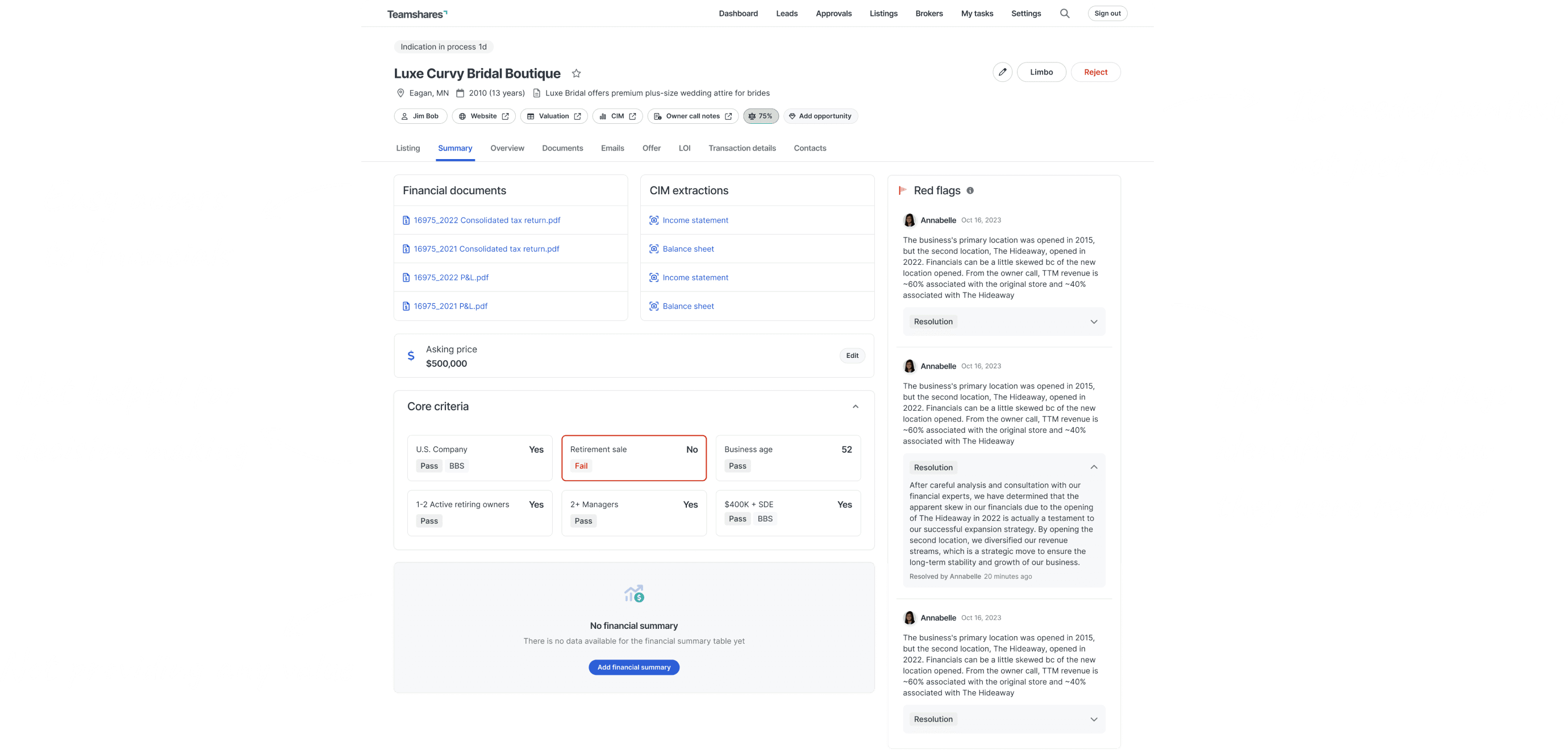 Capture Red Flags and Risks: Equip users to flag potential risks early and monitor key issues throughout the acquisition process.