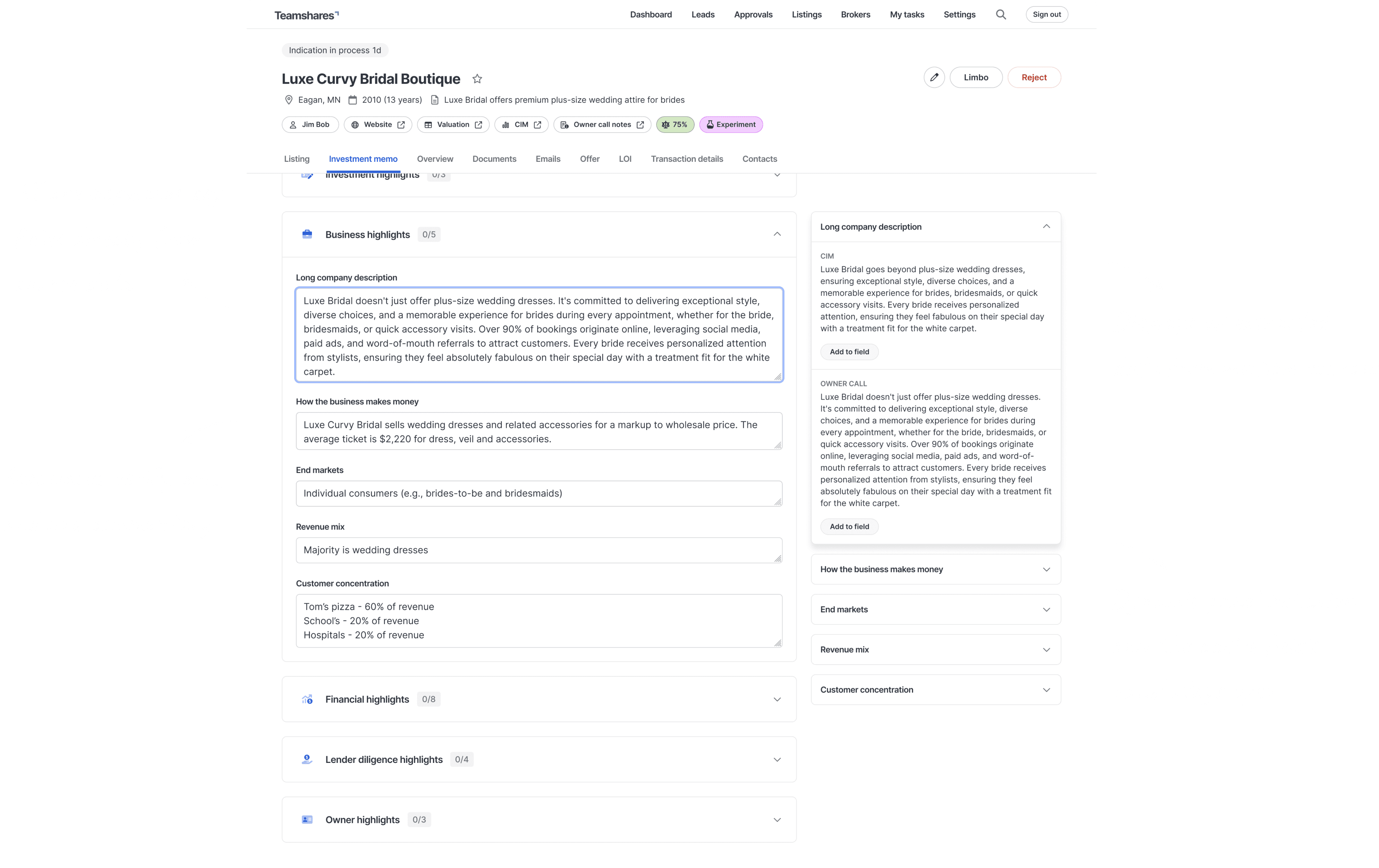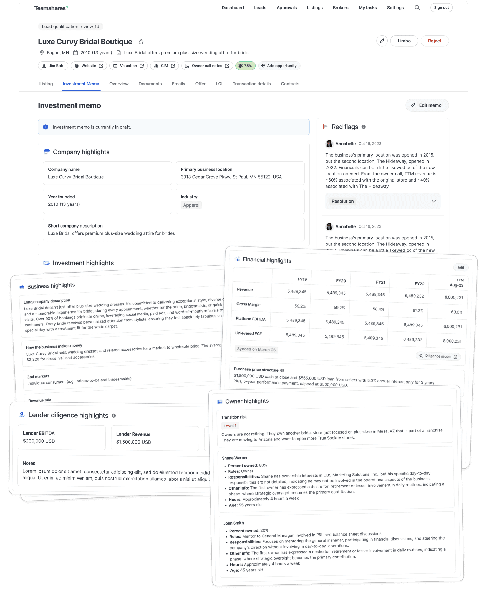 In this workflow, transaction associates review qualified leads in our system, capture key business details, and prepare presentations for the Investment Committee to evaluate potential acquisitions.