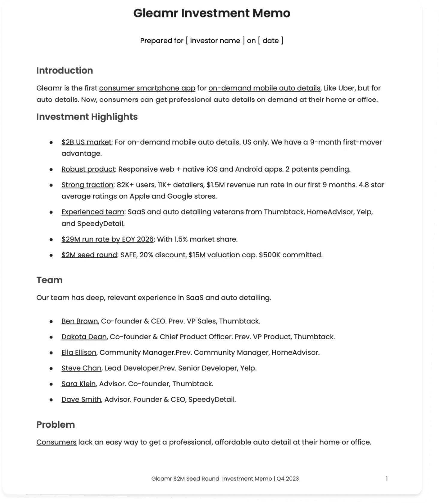 We drew inspiration from how investors and private equity firms use structured investment memos to frame their thinking and communicate rationale.